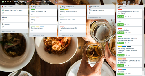 Since the majority of our team and clients are based around European time zones, it made sense to stick to midday UK time. And because that is lunchtime for most of us, we decided to call our knowledge share sessions Food 4 Thought (F4T for short).