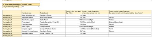 To make sure our carbon footprint calculation would be as accurate as possible, the sheet asked for some really specific details like the mode of transport for each leg of a journey, and the percentage of home energy usage coming from renewable energy sources.