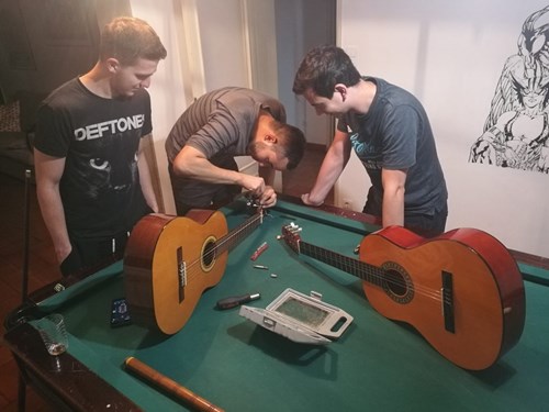 The developers in the team love problem solving, and not only solving the big problems on our projects. The house had two broken guitars, one with a missing tuning key and strings, and the other with all strings but a single missing tuning key that meant the guitar was completely out of tune. Pedro and Mark scoured the house for tools such as pliers to use to tune the guitar but didn’t find anything. Instead, they found a nut cracker and a 4-in-1 kitchen utility tool that they were able to use to operate on the guitars and fix (depending on your definition of fix) one of them.